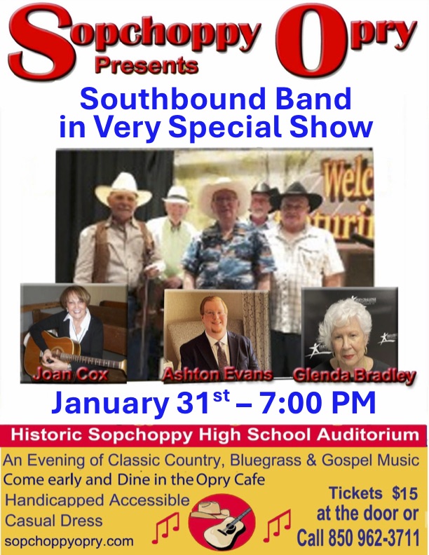 2025 Season tickets on sale now! $120 each! Purchase two (2) season tickets at $120 each and get one (1) free! Call (850) 962-3711 for more details or email jquigg@ymail.com. All net proceeds from the Sopchoppy Opry are used for the restoration of historic Sopchoppy High School!